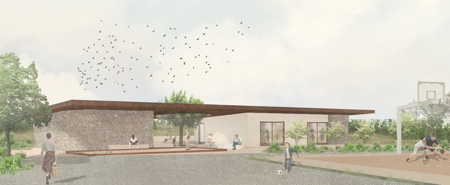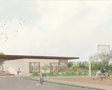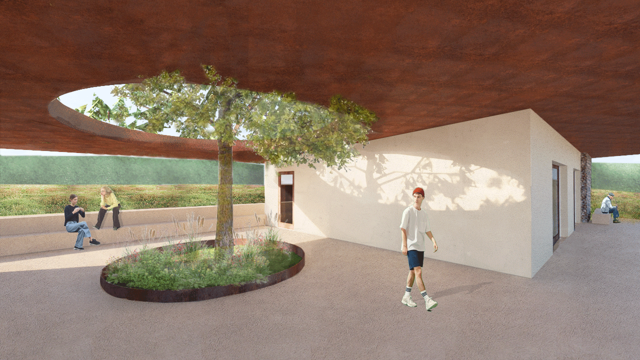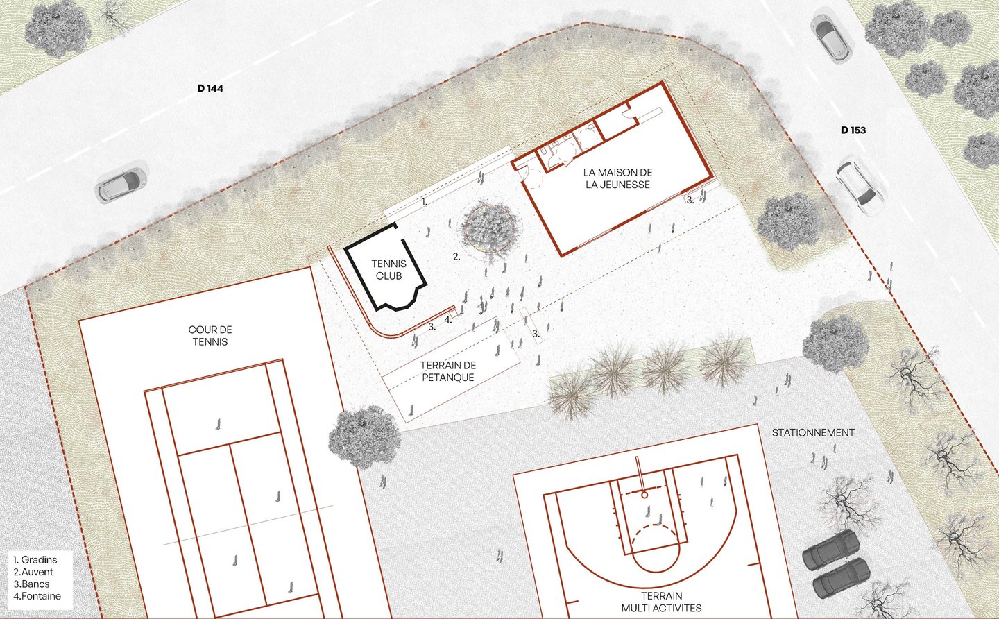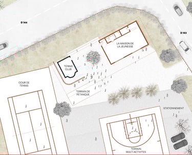 Le projet prend place à proximité d'un tennis club existant et de deux mûriers platane. Le concept né d'une idée de lier les deux lieux (tennis club et la maison de la jeunesse) autour d'un espace extérieur couvert centré sur un puit de lumière s'enroulant autour d'un des arbres. Le projet permet de requalifier les espaces publics à proximité. Le terrain de pétanque et une fontaine sont retravaillés dans le prolongement du lieu.